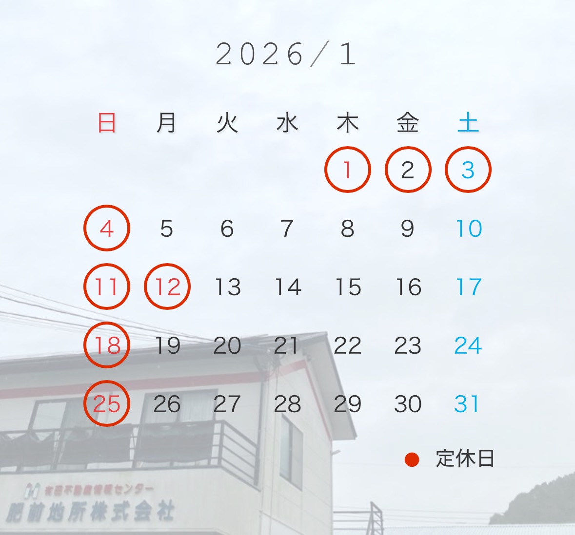 遅くなりましたが、1月定休日のお知らせです。